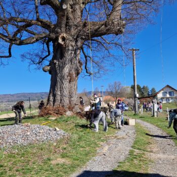 - apríla nás na Šuľkovom vrchu privítalo slnečné ale studené ráno. Stará a mohutná Báťkova lipa si zo zimy nerobila ťažkú hlavu. Tešila sa na ozdravné ošetrenie. Skupina šikovných arboristov pod vedením Maťa Kracinu zo spoločnosti V kolobehu s prírodou s. r. o. ju odľahčila od suchých konárov, trochu preriedila prehustené časti, skrátila konáre popri elektrickom vedení a skontrolovala väzby. Prácu arboristov si prišli obzrieť deti zo ZŠ s MŠ Krivec a ZŠ s MŠ Hriňová, ako aj susedia z blízkeho okolia. Mali sa na čo pozerať. Chránený strom Báťkova lipa je unikát sám o sebe. Sledovať jeho ošetrovanie bolo určite veľkým zážitkom. Deti si potom vyskúšali svoje zručnosti a vedomosti pri enviroaktivitách Správy CHKO-BR Poľana so zameraním na stromy a ich obyvateľov. Merali obvod, výšku stromu, šírku koruny, hľadali dutiny, výmladky či drevokazné huby. Dvaja odvážlivci si vyskúšali aj lezenie. Niektorí po ošetrení pomohli odpratávať popadané konáre.